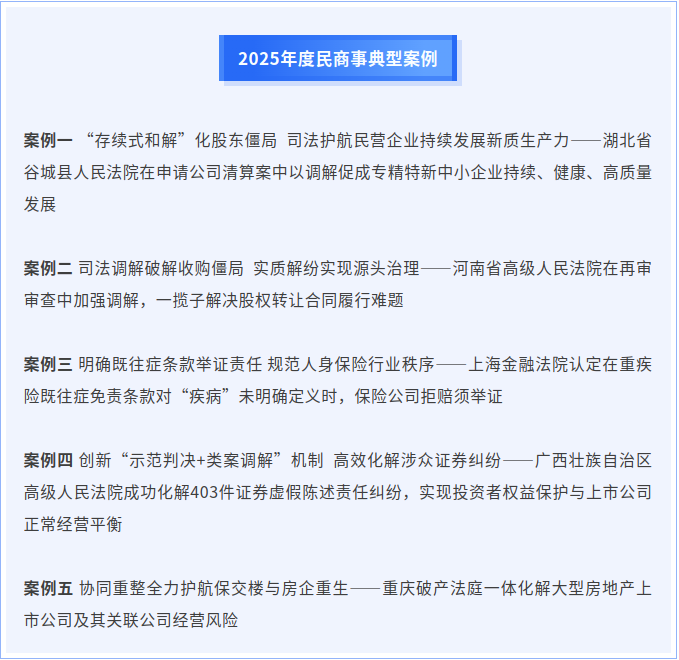 1.2025年度民商事典型案例发布:24日,最高人民法院召开“迎两会·守公正·启新程”第九场新闻发布会,主题是“人民法院民商事审判服务保障经济社会高质量发展情况”。发布会上,最高人民法院民二庭庭长王闯介绍了2025年人民法院民商事审判工作的总体情况、主要举措成效,发布《人民法院民商事审判年度报告(2025)》及典型案例。(最高人民法院)